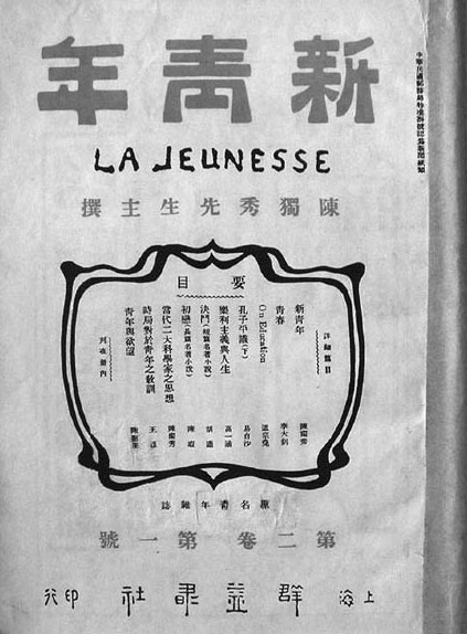 1916年9月,《青年杂志》自第二卷第一号起改名《新青年》。此后,至第七卷第五号,每期的封面都是此设计风格。