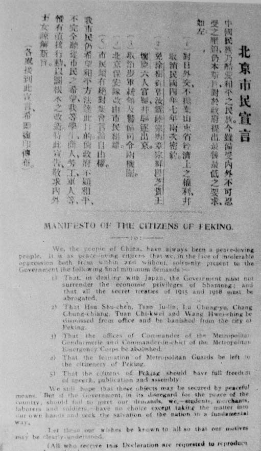 1919年,陈独秀在五四爱国运动中撰写的《北京市民宣言》。