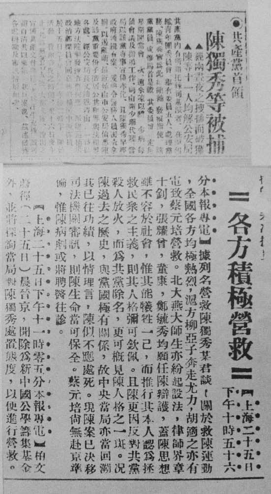 1932年,陈独秀在上海被捕和各方积极营救的新闻报道。