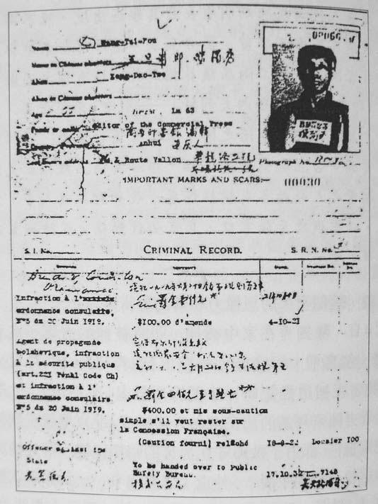 1921年11月,陈独秀(T. S. Chen)以中央局书记身份签署《中国共产党中央局通告》。1921年,陈独秀被捕时化名“王坦甫”的被捕证明。