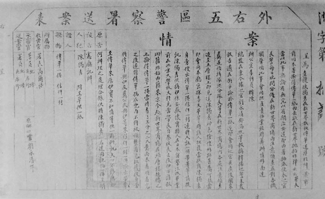 1919年,北京外右五区警察署逮捕陈独秀后呈报的《送案表》。