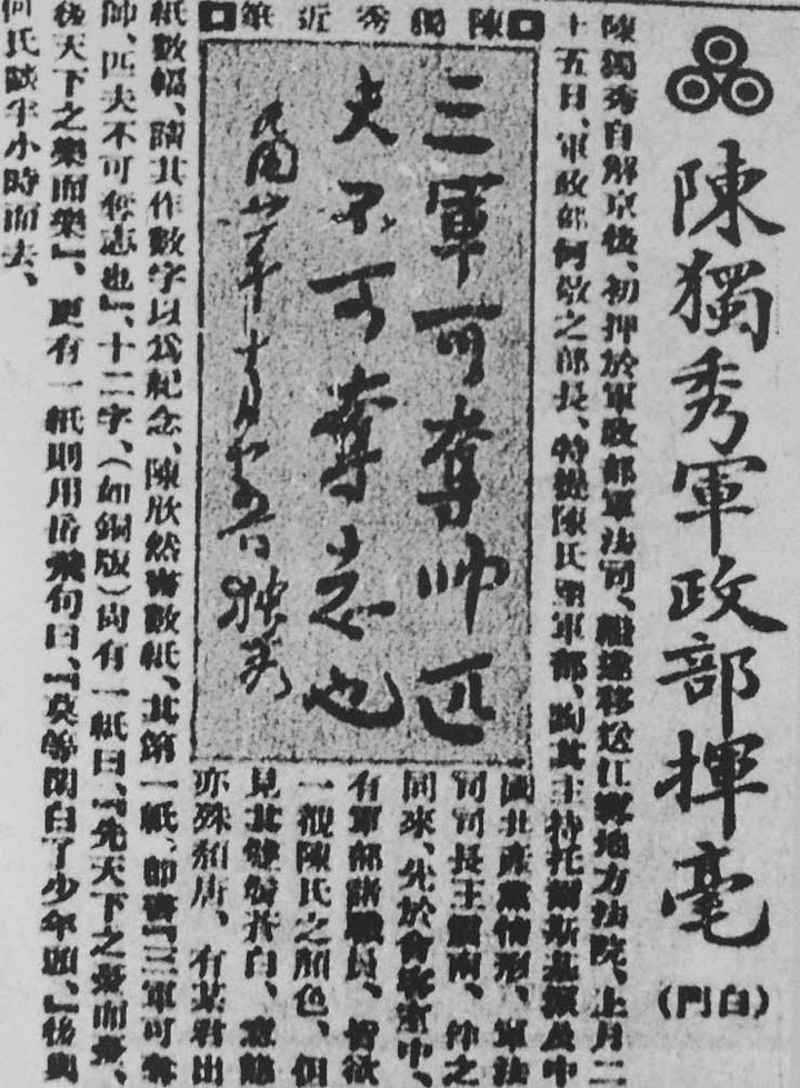 1932年,陈独秀被捕押往南京军政部,应何应钦请求为其挥毫题字:“三军可夺帅,匹夫不可夺志也。”