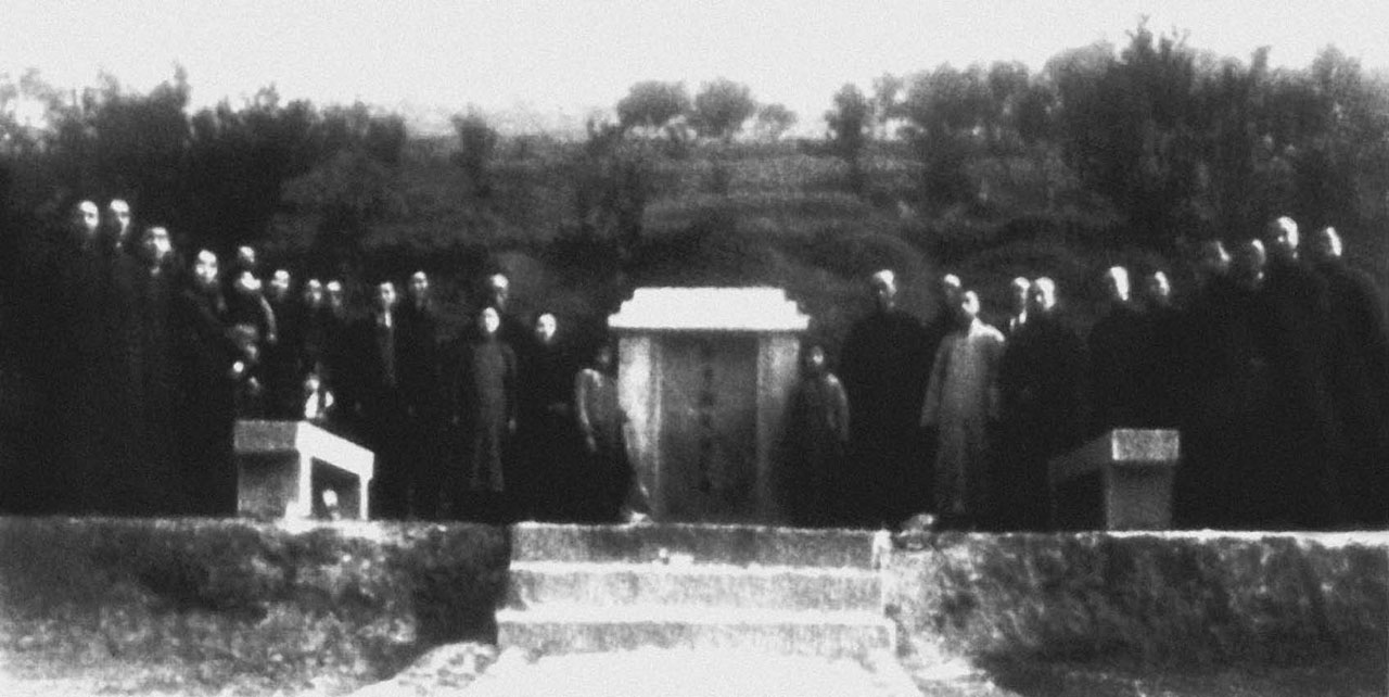 1943年1月1日,陈独秀江津墓道落成仪式。碑文为“独秀陈先生之墓”(葛康俞手书)。陈独秀之子陈松年夫妇(左三、左四),夫人潘兰珍(墓碑左侧第四人),邓燮康(左一)和夫人(墓碑左侧第二人)及两个女儿邓敬苏、邓敬兰(墓碑左右两侧),邓蟾秋(墓碑左侧第三人)、邓仲纯(左二),北大校友会段锡朋(墓碑左侧第六人),何之瑜(右二)等亲朋好友参加了典礼。此照片由胡适保存于台湾。
