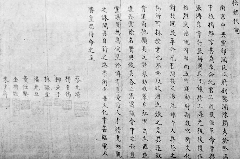 1932年,蔡元培、杨杏佛、柳亚子、林语堂、潘光旦等营救陈独秀的电文。